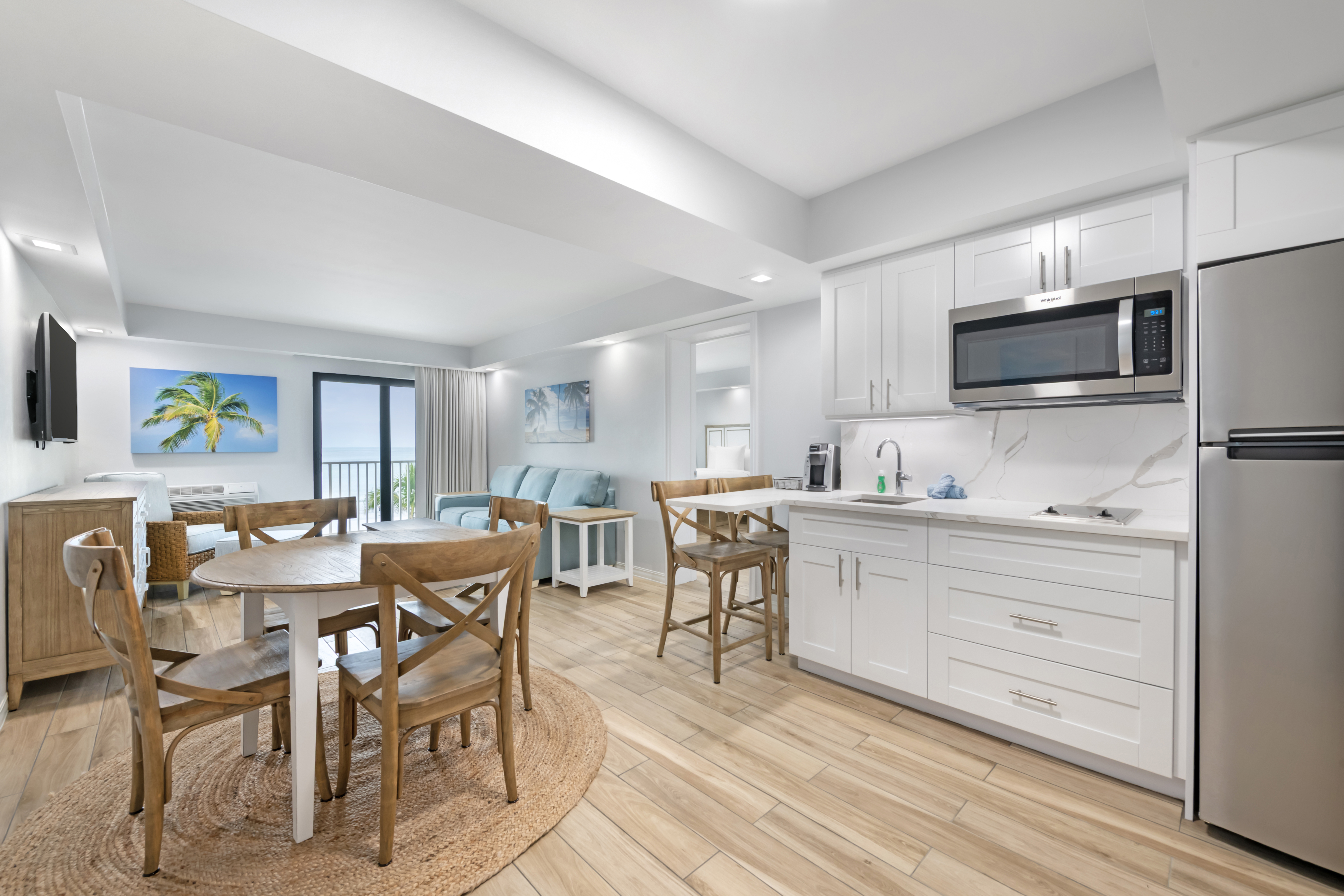 Choose from spacious rooms designed with your comfort in mind. If you’re looking for a little extra space to stretch out and relax, our suites offer a separate living room for entertaining and keep your sleeping area private. All our rooms have a microwave and refrigerator for your snacking needs or choose a room with a fully equipped kitchen. Private balconies overlooking the beach give you an amazing view, and comfortable beds ensure you’ll wake up completely refreshed. Our complimentary breakfast offers balanced and delicious options for everyone. Other free perks include WIFI, a business center offering a printer for your use, and parking for one car per room. Plus, no resort fee!