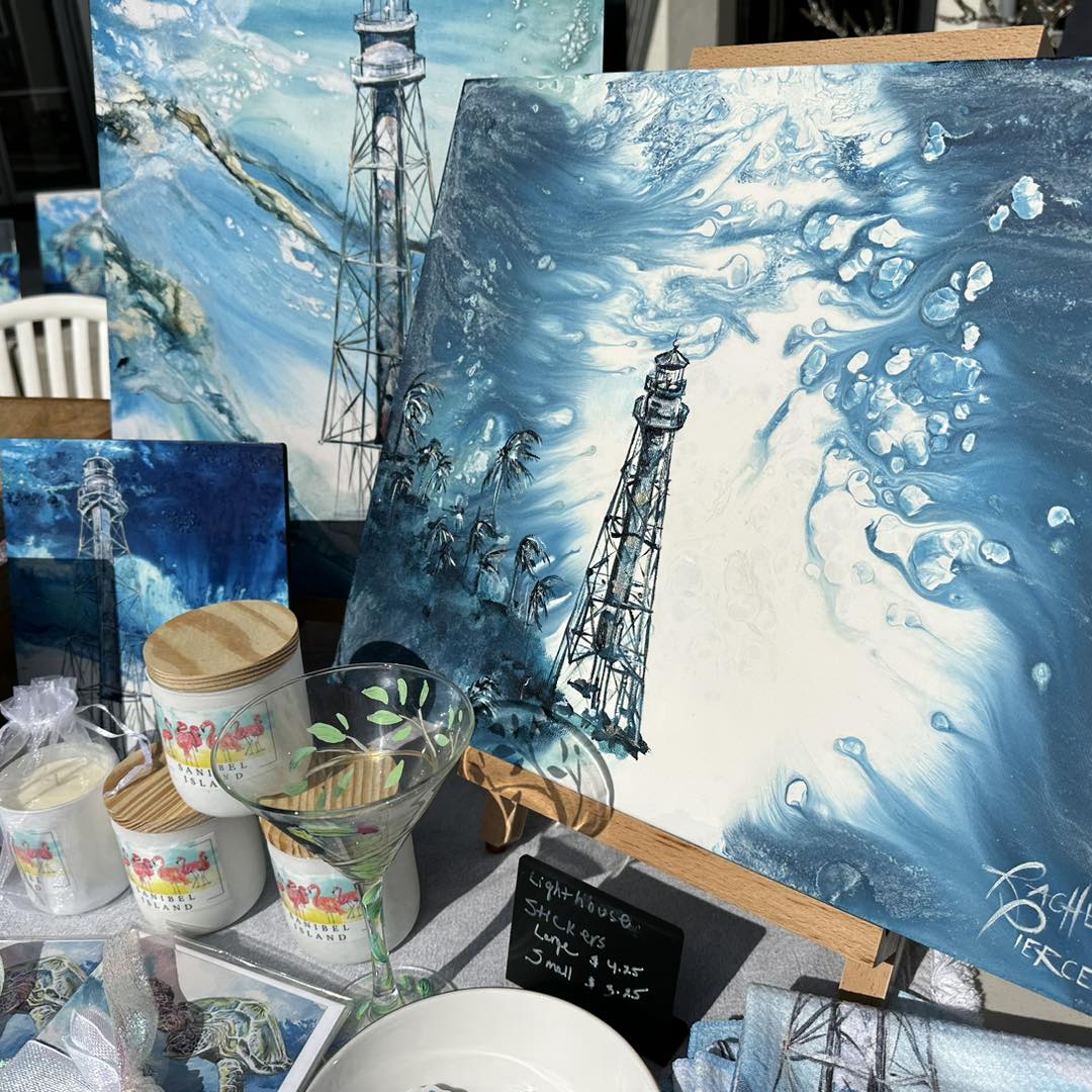 The Rachel Pierce Art Gallery opened in January of 2022 on Sanibel at 1571 Periwinkle Way, and while the interior space undergoes repairs and renovation due to Hurricane Ian, Rachel currently hosts a daily "Outdoor Gallery & Island Market" from 10am to 2pm outside her building, where many different shops, restaurants, businesses, and organizations from across the barrier islands join her every day.