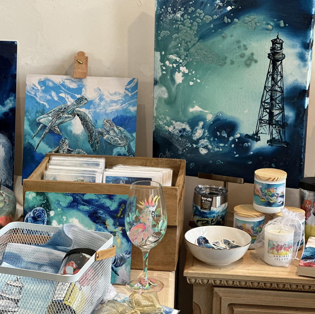 Rachel Pierce paints modern, fantastical, original art in oil and acrylic reflecting the natural beauty and abundant wildlife found only in Southwest Florida. From abstract beachscapes to realistic underwater tableaus, Rachel’s colorful coastal creations teem with tropical creatures and lush flora, and her joyful energy flows through each brushstroke. Popular motifs, including the iconic Sanibel Lighthouse, are also available in a wide variety of prints, fine jewelry, clothing, accessories, home goods, and gifts.