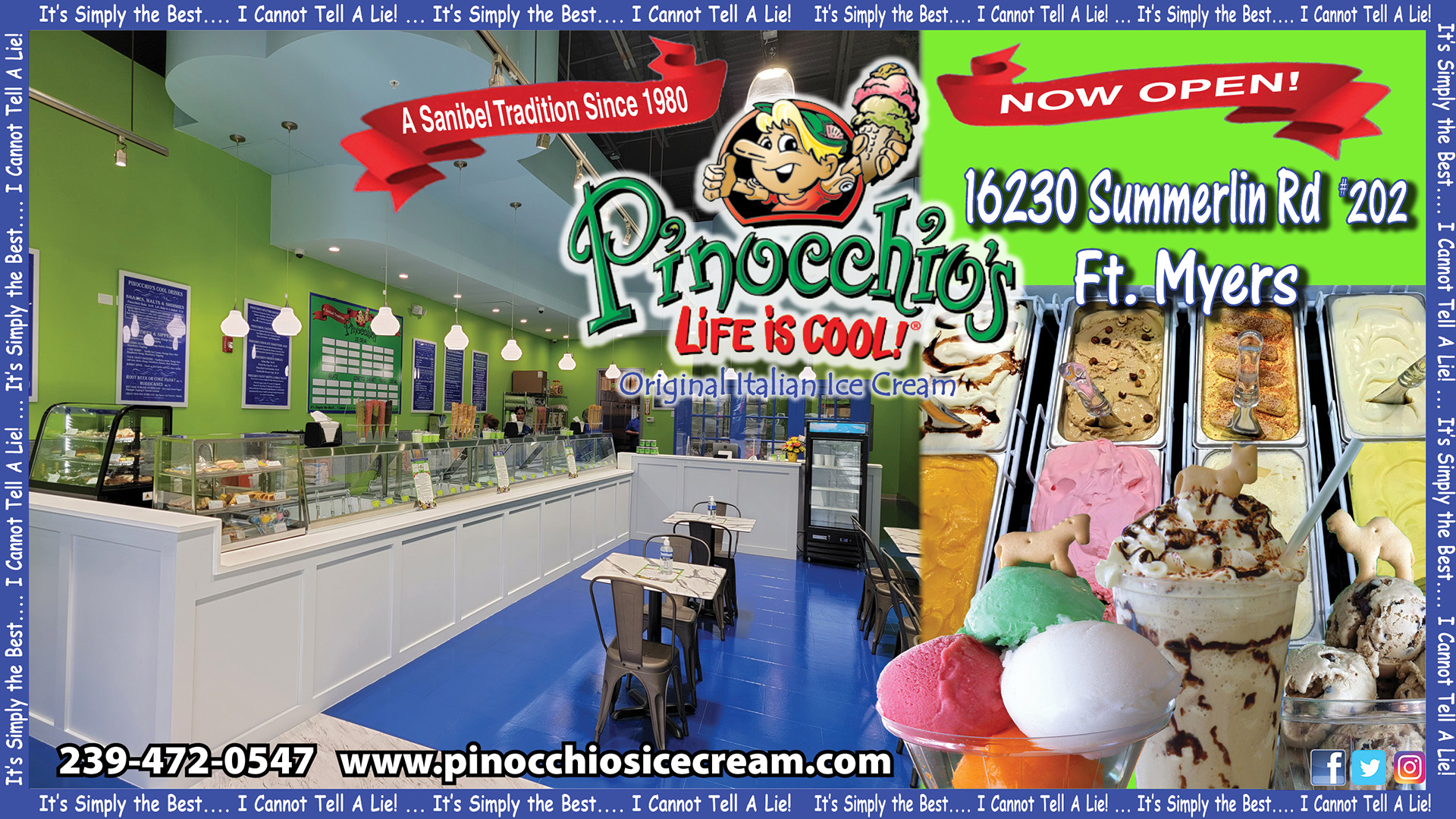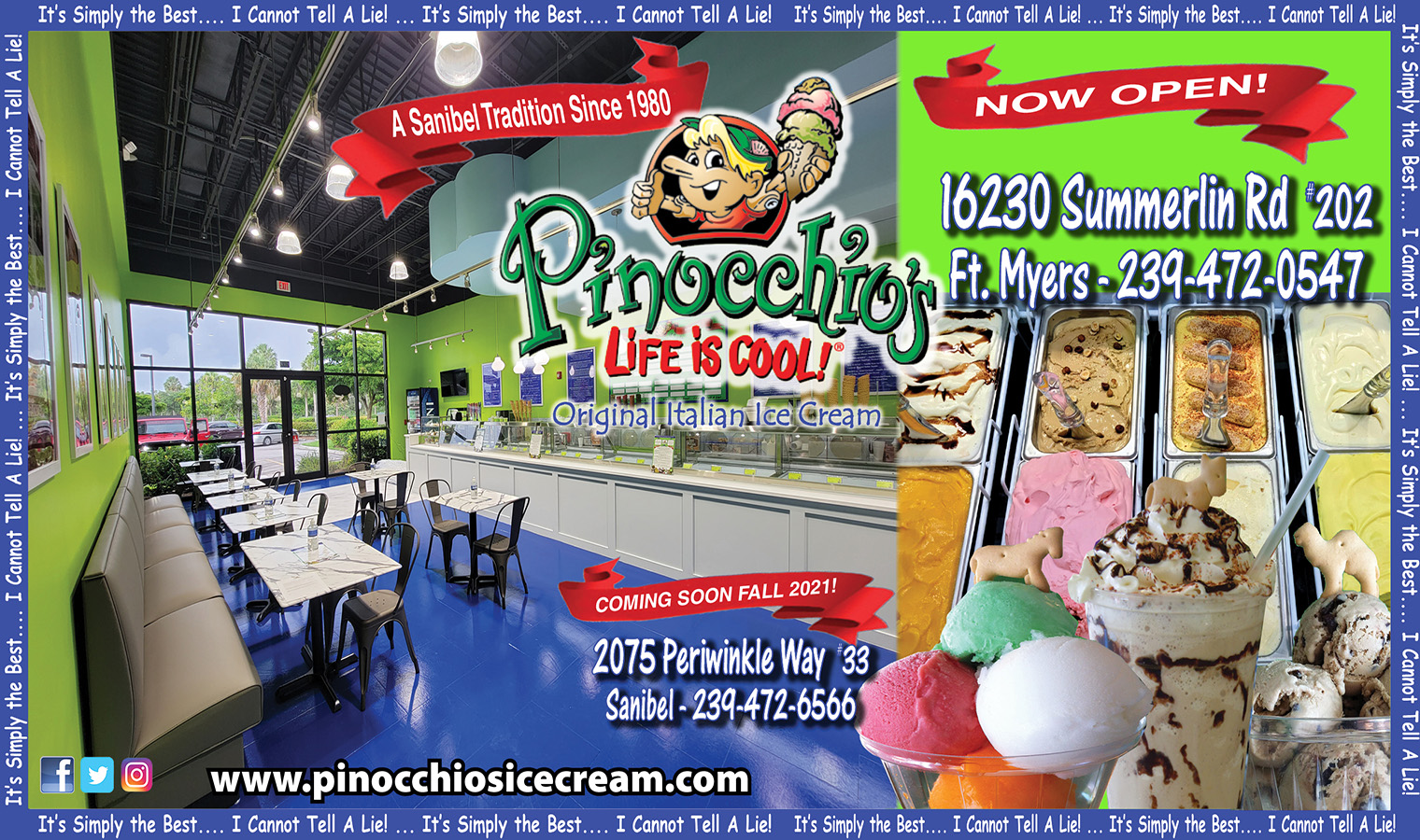 Unique flavors, generous portions and loyal fans describe Pinocchio's Original Italian Ice Cream, a Sanibel tradition since 1980.  Home of Pinocchio's Sanibel Krunch, Dirty Sand Dollar, Wedding Bells, Gator Stew and an ever growing repertoire of 200+ flavors, this iconic dessert shop offers a complete line of frozen confections including ice cream, gelato, sorbet, frozen yogurt, sherbet, Italian custard and semifreddo to accompany non-frozen favorites and espresso specialty drinks. We hope you will give us a try and make Pinocchio's your neighborhood's sweet destination. Come in where Life is Cool!